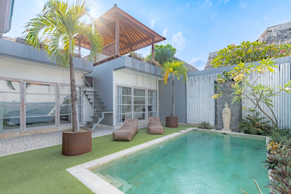 Découvrez le jardin luxuriant de la Villa Telma, où une végétation luxuriante entoure une piscine privée, créant une oasis de sérénité idéale pour se détendre. L’agencement soigné de la villa sur deux niveaux s’intègre harmonieusement à son environnement tropical, offrant un refuge idéal pour profiter du soleil de Bali ou explorer le quartier animé de Seminyak, à quelques minutes seulement. Que vous vous prélassiez au bord de la piscine ou profitiez d’une soirée tranquille sur la terrasse, l’espace extérieur est conçu pour une détente absolue.