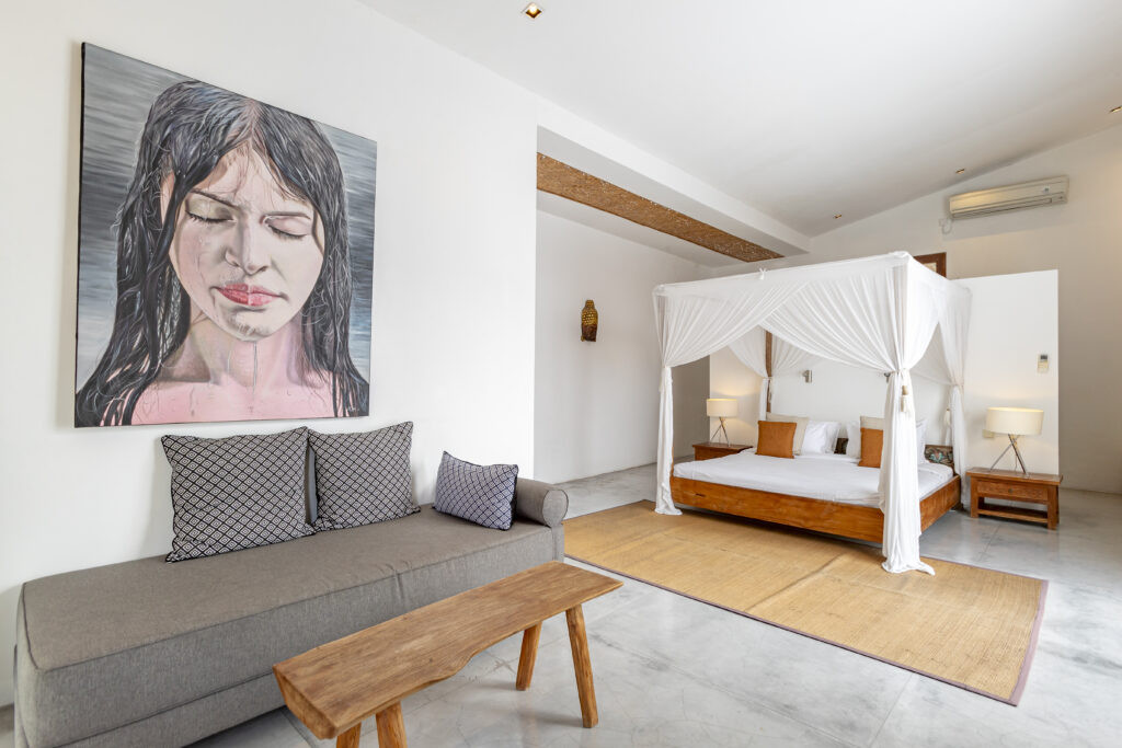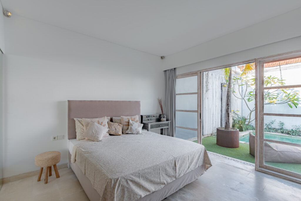 La Villa Telma propose deux chambres au design raffiné, idéales pour une escapade reposante après une journée de découverte de Bali. La suite principale, décorée avec élégance d’inspiration balinaise, dispose d’une salle de bain attenante pour un confort et une intimité absolus. La chambre double à l’étage est idéale pour les familles ou les amis, créant une atmosphère chaleureuse et accueillante pour un séjour inoubliable.