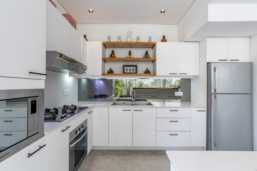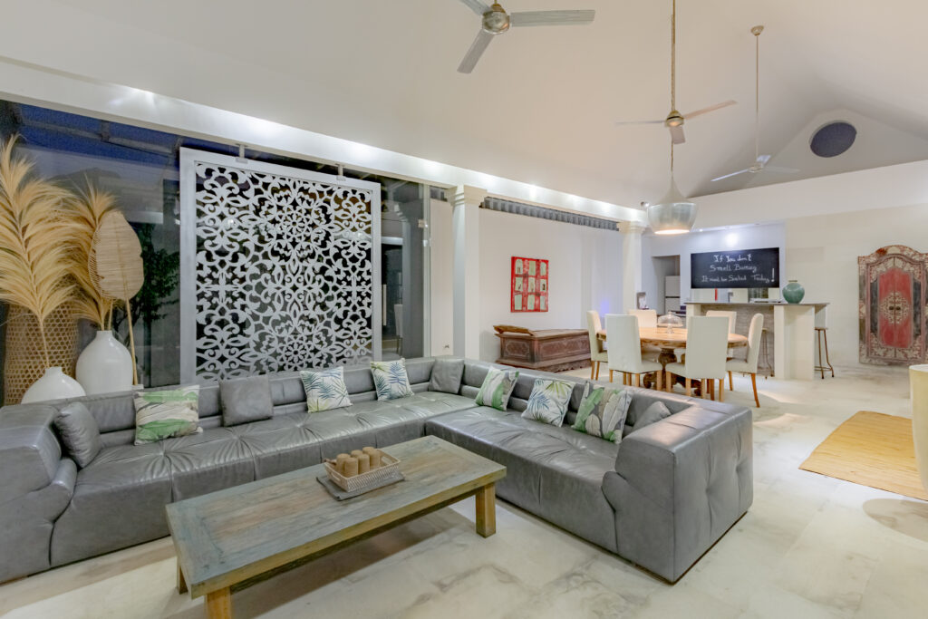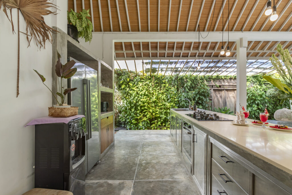 À l’intérieur, la Villa Elea dispose d’un espace de vie contemporain ouvert, parfaitement relié au jardin et à la piscine. La spacieuse salle à manger communique avec la cuisine entièrement équipée, créant ainsi une ambiance harmonieuse pour profiter des repas et des moments privilégiés avec vos proches. L’agencement soigné de la villa s’intègre parfaitement à l’ambiance tropicale de Bali, vous garantissant un séjour élégant et confortable.
