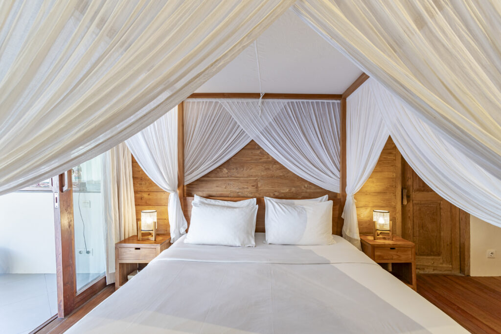 Cette chambre climatisée offre une ambiance paisible pour une nuit reposante. La salle de bain semi-ouverte en pierre, équipée d’une baignoire apaisante et d’une douche rafraîchissante, crée une atmosphère de spa en pleine nature. Que vous souhaitiez commencer votre journée ou vous reposer après avoir exploré Bali, cette chambre est conçue pour le confort et la tranquillité.