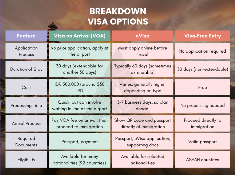Bali menawarkan beberapa pilihan visa tergantung pada kewarganegaraan dan lamanya masa tinggal Anda: