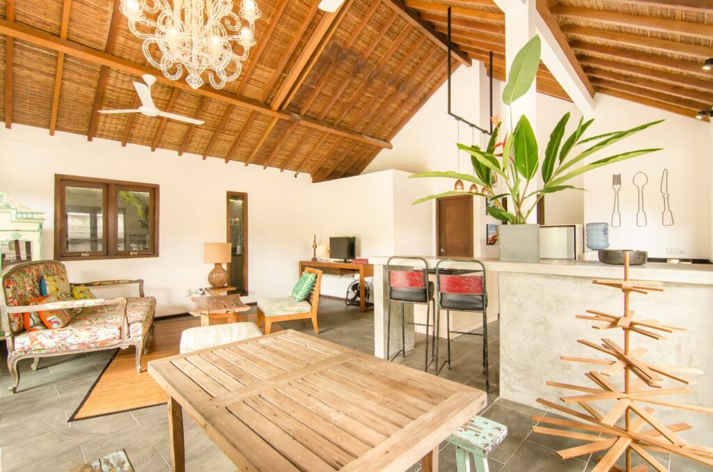 别墅内部采用宽敞的开放式设计,天花板较高,营造出通风舒适的环境。起居区与用餐区和设备齐全的厨房无缝衔接,非常适合烹饪您喜爱的美食或享用附近餐厅的外卖。吊扇带来凉爽的微风,确保您住得愉快。